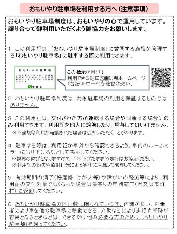 また、利用証をお持ちの方であっても、同乗者の介助などにより、歩行や車の乗降に支障がないときは、利用証を交付されている方の乗降が終わり次第、自動車を一般駐車場へ移動いただくなど、お互いに譲り合って御利用くださいますようお願いします。